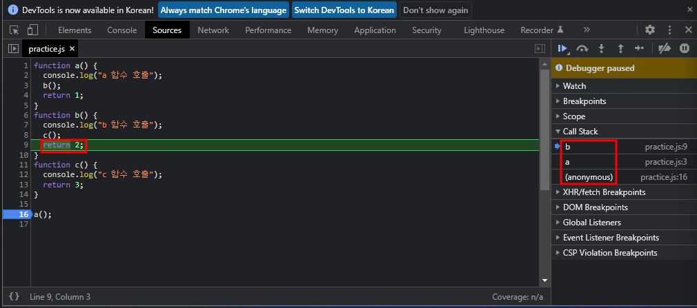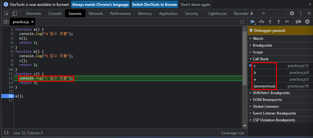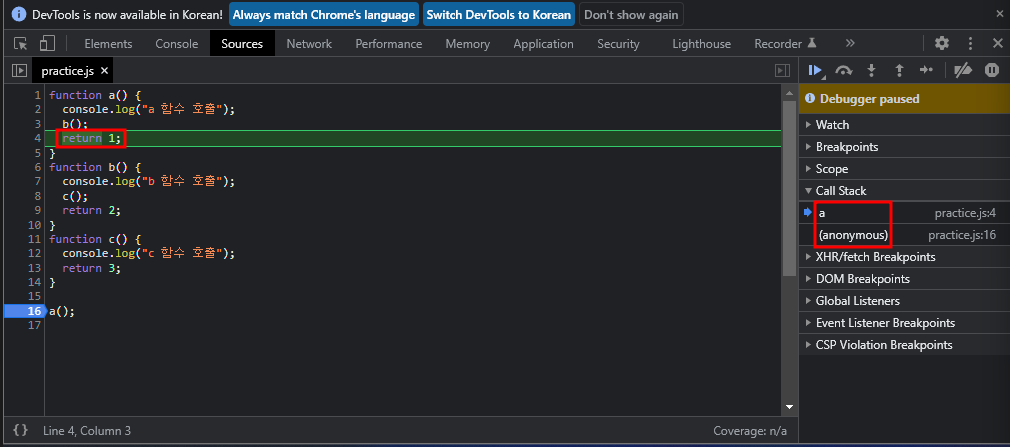 함수 실행 결과1. Javascript가 실행되면 Global Execution Context(anonymous)가 생성되어 Call Stack에 추가된다.2. a 함수를 호출하면 Call Stack에 a 함수를 추가하고 a 함수 호출을 콘솔에 출력한다.3. a 함수 내부에서 b 함수를 호출한다.4. b 함수 호출하면 Call Stack에 b 함수를 추가하고 b 함수 호출을 콘솔에 출력한다.5. b 함수 내부에서 c함수를 호출한다.6. c 함수를 호출하면 Call Stack에 c 함수를 추가하고 c 함수 호출을 콘솔에 출력한다.7. return을 만나 c 함수를 종료한다.8. c 함수가 종료되어 Call Stack에서 제거되고 다시 return을 만나 b 함수를 종료한다.9. b 함수가 종료되어 Call Stack에서 제거되고 다시 return을 만나 a 함수를 종료한다.10. a 함수가 종료되어 Call Stack에서 제거되고 Global Execution Context(anonymous)만 남는다.11. 모든 실행이 완료되어 Global Execution Context(anonymous)도 Call Stack에서 제거된다.