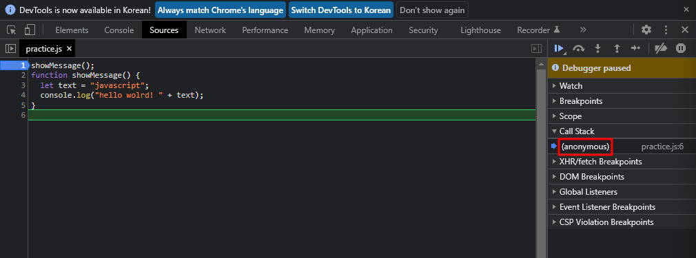 showMessage 함수 실행 결과1. Javascript가 실행되면 Global Execution Context(anonymous)가 생성되어 Call Stack에 추가된다.2. showMessage 함수가 호출되면서 Call Stack에 추가되고 showMessage 함수 내부에 있는 코드들이 실행된다.3. showMessage 함수가 종료되어 Call Stack에서 제거되고 Global Execution Context(anonymous)만 남는다.4. 모든 실행이 완료되어 Global Execution Context(anonymous)도 Call Stack에서 제거된다.